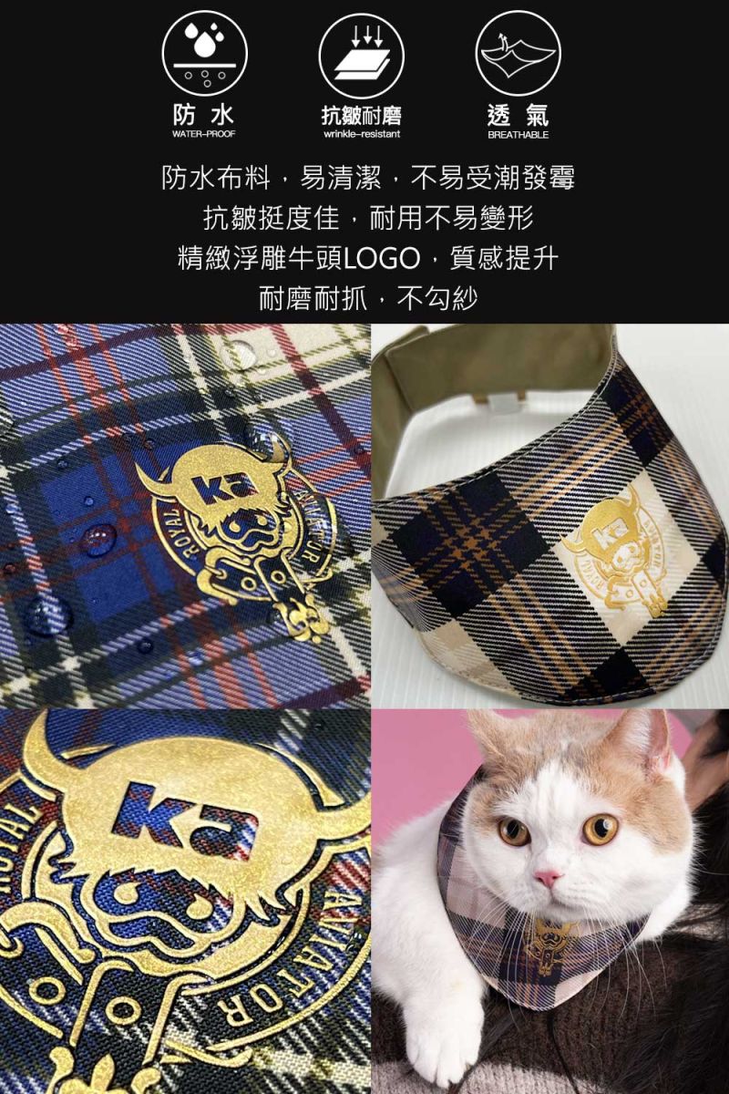 .防水不易受潮、不易發霉 .耐磨、耐洗強度佳、不易變形 .透氣性佳,棉料觸感柔軟舒適 .頸圍可調節,適合各種體型毛孩 .皇家牛頭金標,經典格紋配色,毛孩時髦的新高度