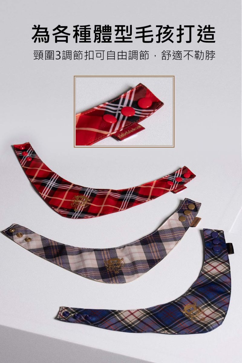 .防水不易受潮、不易發霉 .耐磨、耐洗強度佳、不易變形 .透氣性佳,棉料觸感柔軟舒適 .頸圍可調節,適合各種體型毛孩 .皇家牛頭金標,經典格紋配色,毛孩時髦的新高度