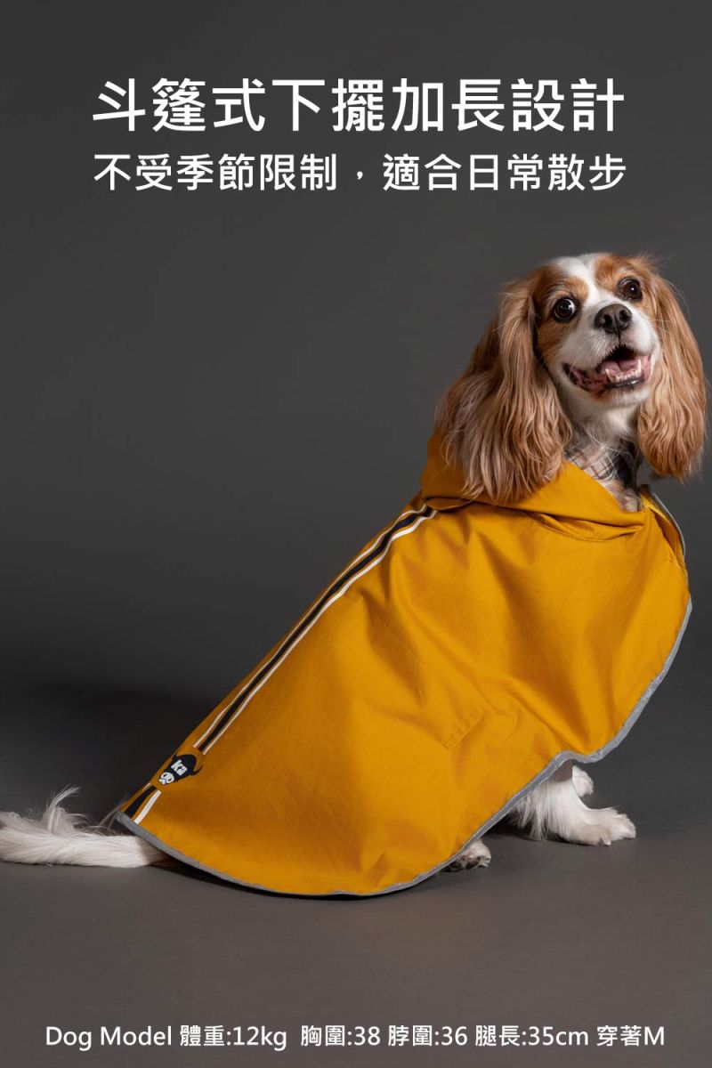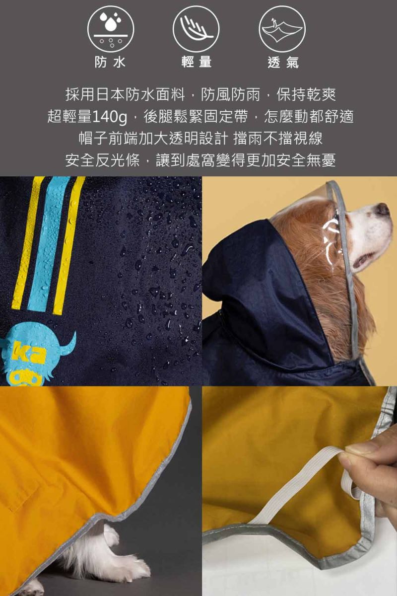 .採用日本防水面料,防風防雨,保持乾爽 .帽子前端透明設計 擋雨不擋視線 .背部胸背帶開孔,防雨遮蓋有效阻擋雨水滲入 .腹部魔鬼氈自由調節,活動不歪斜 .後腿鬆緊固定帶,確保雨衣穩定貼合 .魔鬼氈設計,方便快速穿脫 .安全反光條,讓到處窩變得更加安全無憂 .外層材質靜音面料,降低摩擦聲 .輕量可收納於附贈的品牌LOGO收納袋