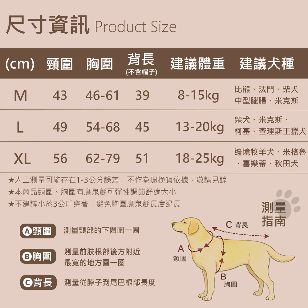.採用日本防水面料,防風防雨,保持乾爽 .帽子前端透明設計 擋雨不擋視線 .背部胸背帶開孔,防雨遮蓋有效阻擋雨水滲入 .腹部魔鬼氈自由調節,活動不歪斜 .後腿鬆緊固定帶,確保雨衣穩定貼合 .魔鬼氈設計,方便快速穿脫 .安全反光條,讓到處窩變得更加安全無憂 .外層材質靜音面料,降低摩擦聲 .輕量可收納於附贈的品牌LOGO收納袋