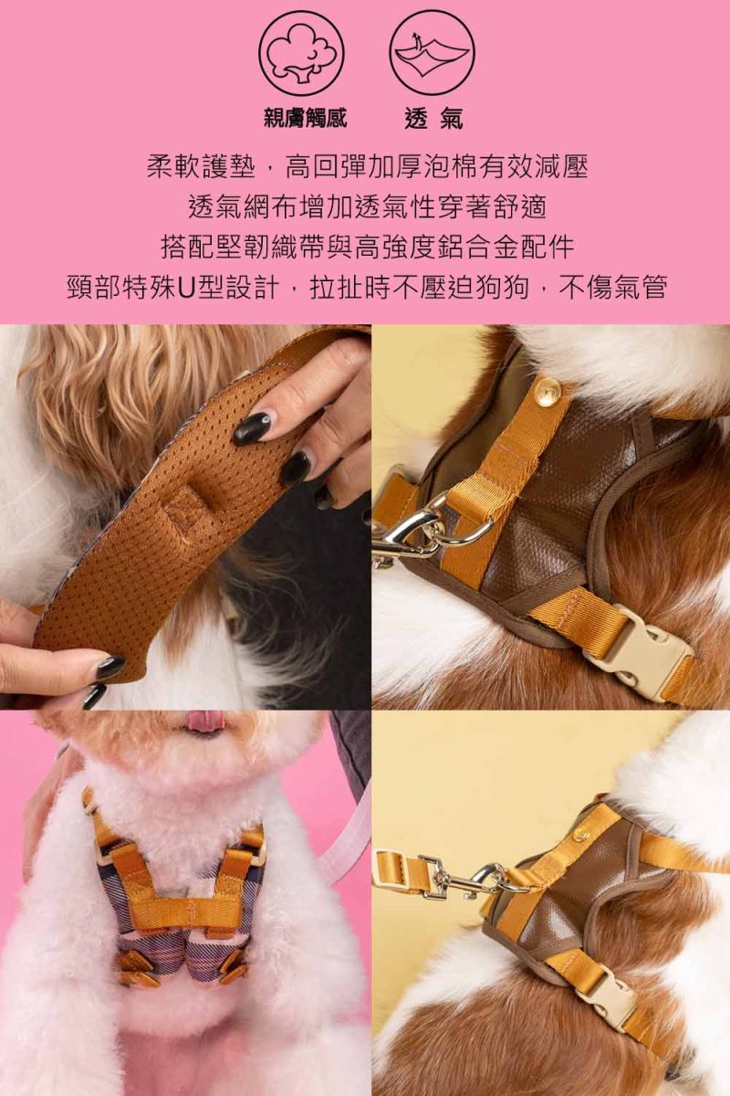 .拉扯時不壓迫狗狗,不傷氣管 .柔軟護墊,高回彈加厚泡棉有效減壓 .透氣網布增加透氣性穿著舒適 .長度可調節,適合各種體型 .柔軟皮革勾環,質感提升 .金安德森質感金扣點綴貴族氣息